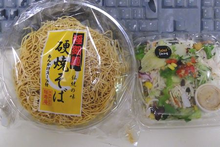 スーパーで購入した 皿うどん用の硬焼きそばと野菜サラダです