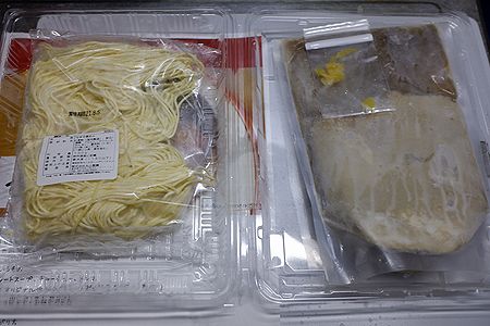 パックの中には 麺と 叉焼 メンマが入ったスープ