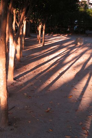 帰ってきた 家の近所の公園では 夕日が木々の陰を