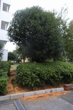 郊外会社線沿線の 団地の庭先にあるキンモクセイ
