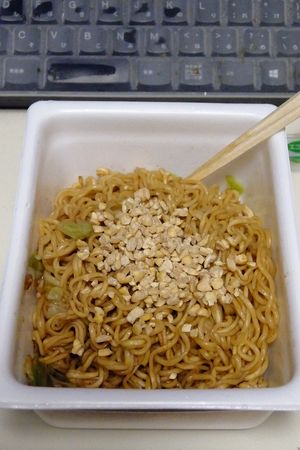 朝食は ペヤングやきそばプラス納豆 です