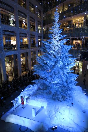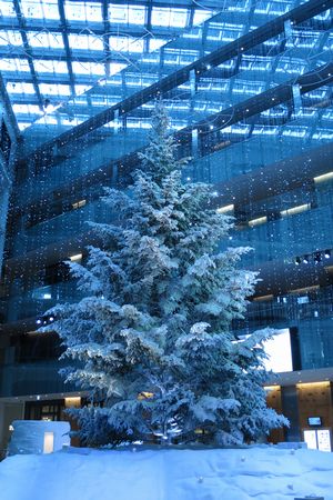 雪に彩られた ツリーの手前には イベントの準備が