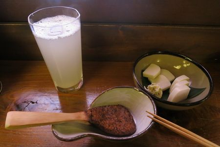 そして獲物は 焼酎の蕎麦湯割りと 焼き味噌