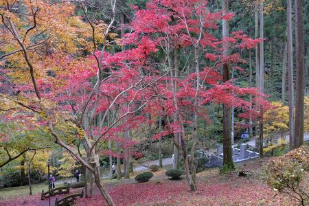 木の枝にも 下の地面にも 赤く染まるもみじの落ち葉