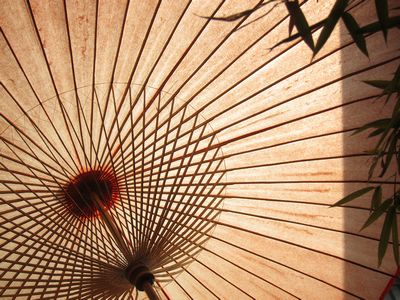 店先にある大きな番傘を 店内から撮影
