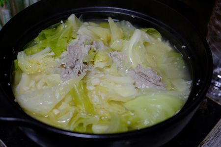 メインは キャベツとバラ肉の鍋です 味付けは塩味のみ