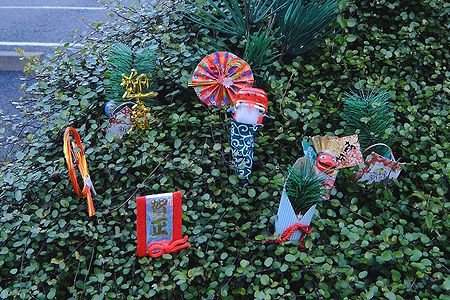玄関先の植え込みに 正月の縁起小物を刺して
