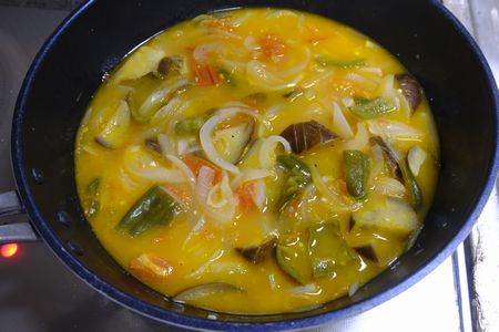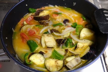 玉ねぎ ナス ピーマン トマト を煮込んでいると