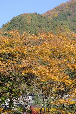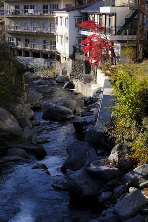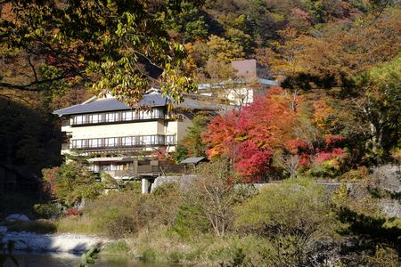 川沿いの旅館の紅葉 目を引きます