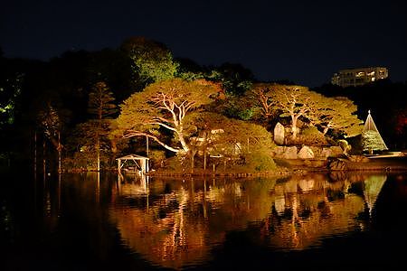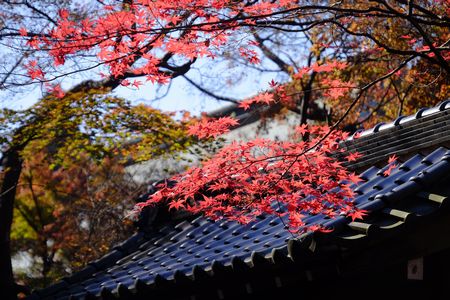 未だ染まらない青葉と バックの紅葉のコントラストを