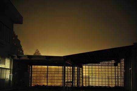 工場の建物の向こうにあるガソリンスタンドの明かりが