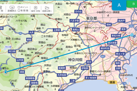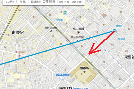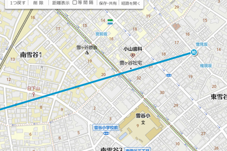 先ずは 雪見坂から冨士山の方角を確認するため マピオンの距離測を利用