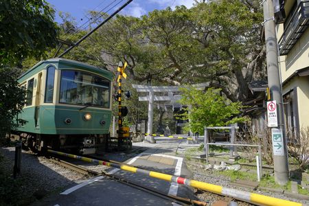 御霊神社前の踏切で 江ノ電を撮影