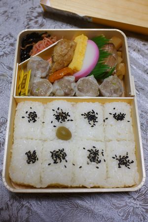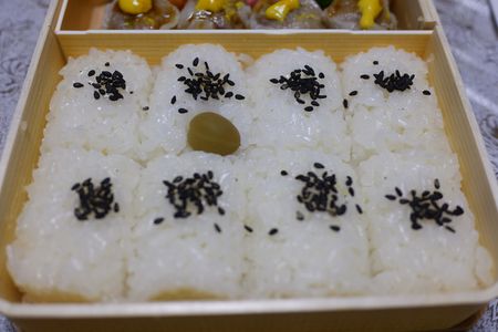 お馴染みの 俵型ごはんと小梅もいつも通り いただきまぁす!