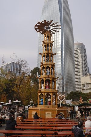クリスマスピラミッドを中心に 物販の小屋が並びます
