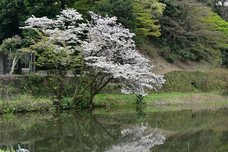 池の水面に映る桜を撮りましたが 手前の芝地を避けると花が欠けます