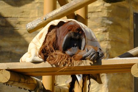 本日一番目を引いたのは 毛布を巻いて暖を取るオランウータンでした