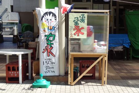 駄菓子屋の前にかき氷の宣伝看板