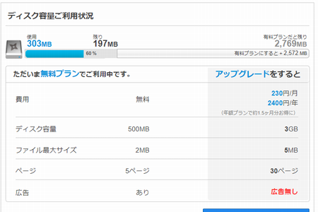 有料プランにすると サーバーの容量も UP出来る容量も増えますが