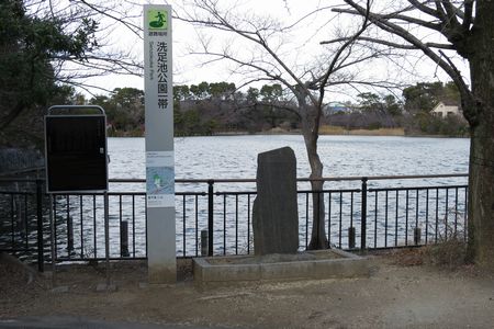 洗足坂の改修記念碑は この先の横断歩道を渡った 池の端にあります
