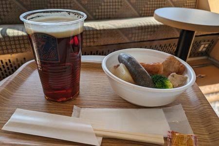 今や引退した登山電車の中でいただきます どちらも箱根ビールがお供です