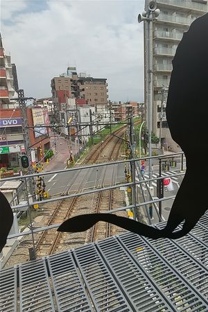 しぶそばの「し」の字越しの池上線 そばを食べ始めたら電車が通過