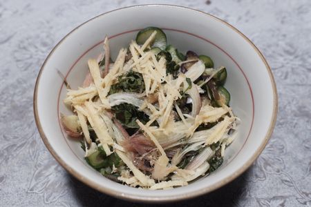 水気を絞ったきゅうりとナスに 茗荷 生姜 大葉の千切りなどをのせて